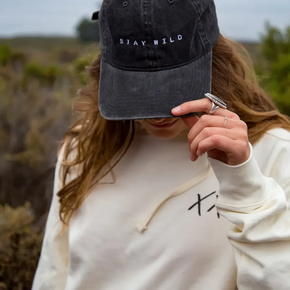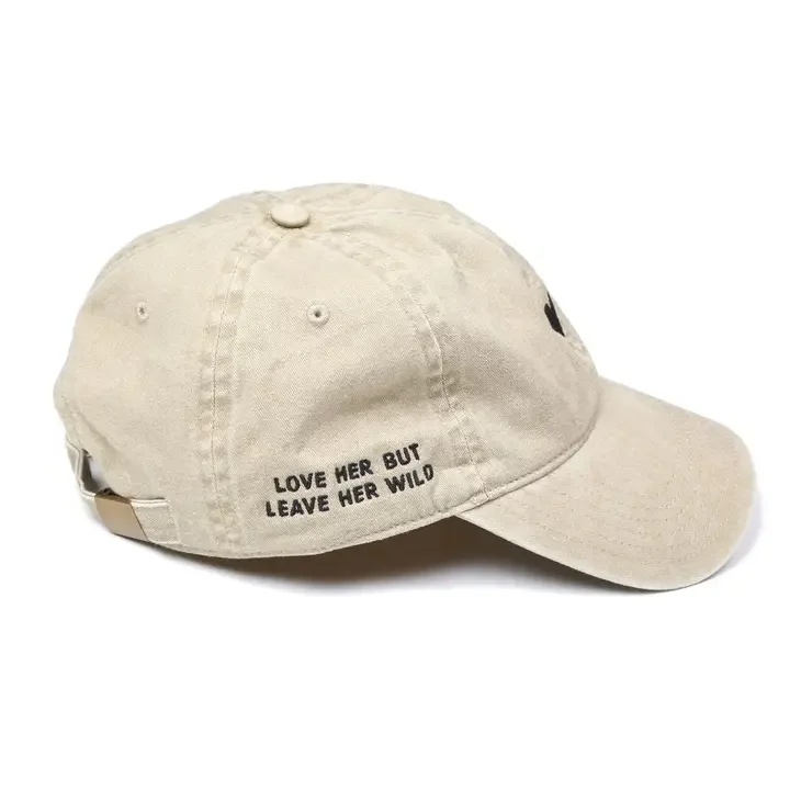 Embroidered with a heart front and "LOVE HER BUT LEAVE HER WILD" on the side, this 100% pigment-dyed brushed cotton hat combines durability and comfort. Its soft, worn-in feel improves over time. The unstructured dad hat fit is lightweight, breathable, and adjustable with a brass buckle. Perfect for gifting, travel, or daily wear, it suits a free-spirited lifestyle.